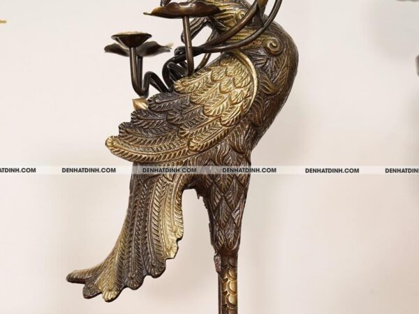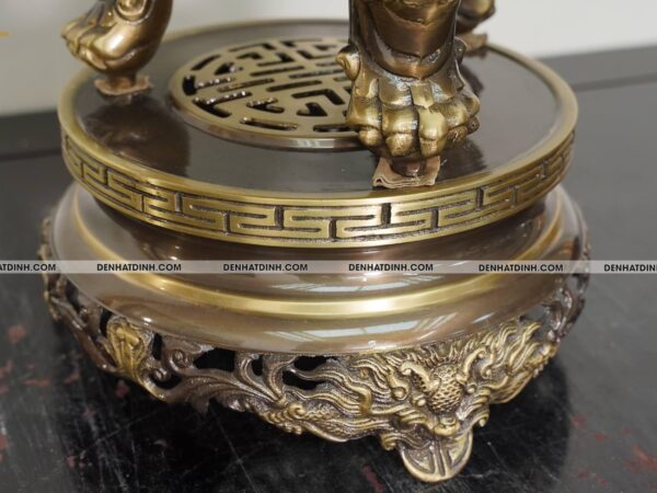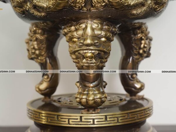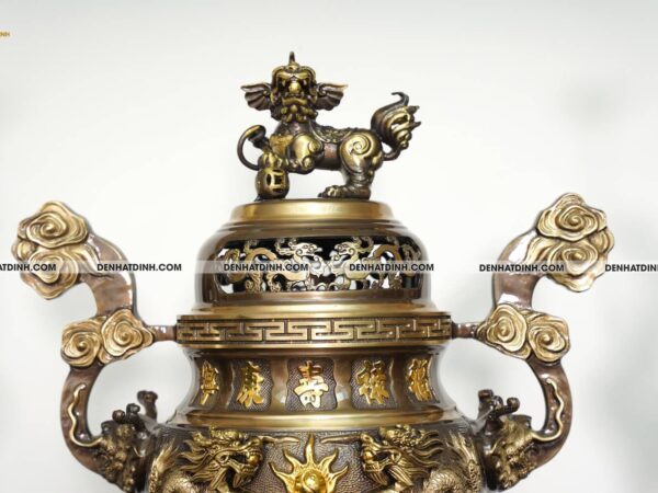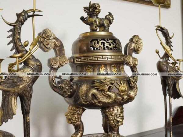 Bộ đỉnh thờ Ngũ Sự Song Long 66 Hun Cổ là một tuyệt phẩm tinh xảo, được chế tác độc quyền bởi xưởng đồng Đệ Nhất Đỉnh. Bộ sản phẩm gồm 5 món gồm một đỉnh đồng cao 66cm, hai hạc thờ cao 68cm và hai chân nến cao 51cm. Tổng trọng lượng cả bộ đạt 36kg, thể hiện sự bề thế và đẳng cấp cho không gian thờ cúng. Chất liệu chính là đồng hun cổ, có độ bền cao và màu sắc trầm ấm, mang đậm phong cách cổ truyền. Màu hun cổ được xử lý kỹ lưỡng, tạo nên lớp bề mặt nhám nhẹ, vừa sang trọng vừa cổ kính. Đỉnh đồng thiết kế kiểu Song Long chầu nguyệt, thể hiện sự uy nghi và linh thiêng, từng chi tiết rồng được đúc nổi công phu, toát lên vẻ dũng mãnh và quyền lực. Nắp đỉnh có tượng Nghê đứng chầu, biểu tượng cho sự canh giữ linh khí, trấn áp tà ma, mang lại bình an cho gia đạo. Thân đỉnh được chạm nổi hoa văn tinh xảo, hài hòa trong từng chi tiết, có lỗ thoát khói được sắp xếp hợp lý, đảm bảo công năng sử dụng khi thắp trầm. Đôi hạc đứng trên lưng rùa thể hiện sự trường thọ, vững chãi, dáng đứng thanh thoát, đầu ngẩng cao mang đậm nét tâm linh truyền thống. Hạc được trang trí thêm đèn hoa sen ở miệng, tượng trưng cho sự thanh khiết, cao quý, thích hợp với không gian thờ tự trang nghiêm. Chân nến được thiết kế dạng hoa sen, phần thân trụ tròn vững chắc, bề mặt chạm hoa văn cổ điển mềm mại, thể hiện sự hòa hợp giữa mỹ thuật và tâm linh. Mỗi chi tiết của bộ đỉnh được hoàn thiện bằng tay, đảm bảo độ sắc nét và độ cân xứng tuyệt đối. Màu sắc sản phẩm đồng nhất, bề mặt chống oxi hóa tốt, dễ dàng vệ sinh và bảo quản lâu dài. Bộ sản phẩm phù hợp đặt trên ban thờ gia tiên, từ đường hoặc không gian thờ cúng trong các cơ sở tín ngưỡng, đem lại cảm giác thiêng liêng, tôn nghiêm và sang trọng.