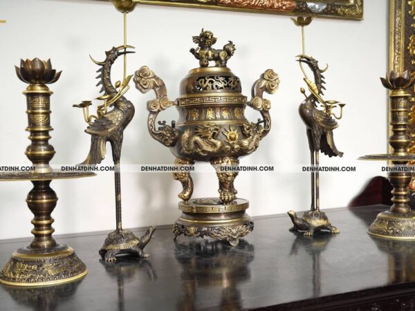 Bộ đỉnh thờ Ngũ Sự Song Long 66 Hun Cổ được bố trí theo thế tam tài, phù hợp với nguyên tắc âm dương ngũ hành trên bàn thờ. Đỉnh thờ được đặt ở vị trí trung tâm, ngay chính giữa bàn thờ, phía dưới bức hoành phi hoặc ngai thờ, thể hiện vị trí trung tâm tụ khí và là nơi dâng hương linh thiêng. Đôi hạc được đặt cân xứng hai bên đỉnh thờ, đầu hạc hướng vào đỉnh tạo thế hướng nội, thể hiện lòng thành kính và sự kết nối giữa trời và đất. Hạc thờ nên đặt hơi chếch về phía trong, không sát mép bàn để đảm bảo sự cân đối và không làm cản trở việc cúng lễ. Phần lưng rùa của hạc nên quay về phía trước, thể hiện sự vững vàng và trường tồn. Đôi chân nến đặt phía ngoài cùng, cách đôi hạc một khoảng đều nhau, đảm bảo yếu tố cân xứng và thuận tiện khi sử dụng. Nến thường được thắp vào các dịp lễ tết, ngày rằm hoặc mùng một để tạo ánh sáng linh thiêng, tôn nghiêm. Khi sắp xếp cần đảm bảo không gian thoáng đãng, không chồng chéo vật phẩm lên nhau để giữ gìn sự tôn nghiêm. Nên lau chùi và giữ gìn sản phẩm luôn sạch sẽ, sáng bóng để duy trì năng lượng tích cực và giữ gìn vẻ đẹp vốn có của bộ đồ thờ. Ban thờ đặt sản phẩm nên vững chắc, cao ráo, tránh vị trí ẩm thấp hoặc nơi có luồng khí xấu. Ánh sáng nên hài hòa, không quá chói và cũng không quá tối để đảm bảo vẻ đẹp uy nghiêm của bộ đỉnh được tôn lên trọn vẹn. Việc bố trí đúng cách không chỉ tạo nên vẻ đẹp tổng thể mà còn kích hoạt năng lượng phong thủy tốt lành cho không gian thờ cúng.