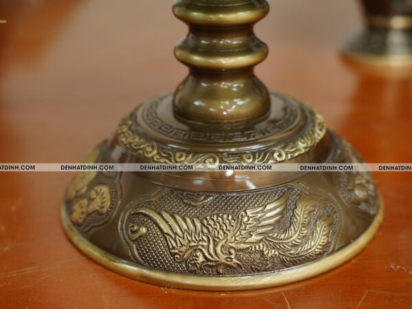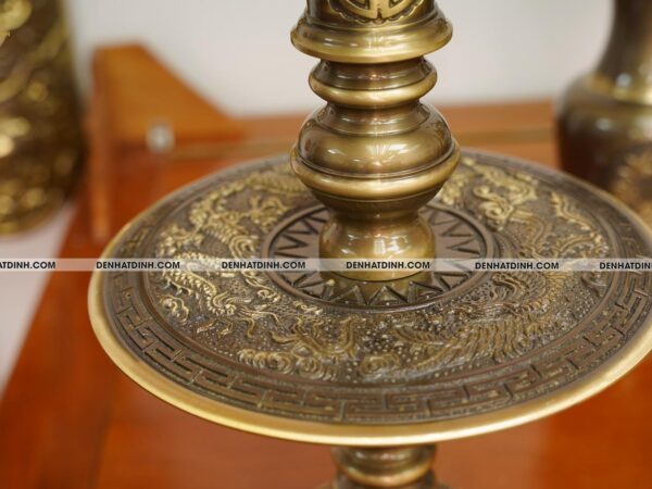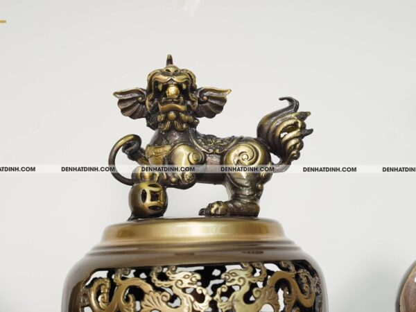 Bộ đỉnh thờ Ngũ Sự Song Long 66 Hun Cổ là một tuyệt phẩm tinh xảo, được chế tác độc quyền bởi xưởng đồng Đệ Nhất Đỉnh. Bộ sản phẩm gồm 5 món gồm một đỉnh đồng cao 66cm, hai hạc thờ cao 68cm và hai chân nến cao 51cm. Tổng trọng lượng cả bộ đạt 36kg, thể hiện sự bề thế và đẳng cấp cho không gian thờ cúng. Chất liệu chính là đồng hun cổ, có độ bền cao và màu sắc trầm ấm, mang đậm phong cách cổ truyền. Màu hun cổ được xử lý kỹ lưỡng, tạo nên lớp bề mặt nhám nhẹ, vừa sang trọng vừa cổ kính. Đỉnh đồng thiết kế kiểu Song Long chầu nguyệt, thể hiện sự uy nghi và linh thiêng, từng chi tiết rồng được đúc nổi công phu, toát lên vẻ dũng mãnh và quyền lực. Nắp đỉnh có tượng Nghê đứng chầu, biểu tượng cho sự canh giữ linh khí, trấn áp tà ma, mang lại bình an cho gia đạo. Thân đỉnh được chạm nổi hoa văn tinh xảo, hài hòa trong từng chi tiết, có lỗ thoát khói được sắp xếp hợp lý, đảm bảo công năng sử dụng khi thắp trầm. Đôi hạc đứng trên lưng rùa thể hiện sự trường thọ, vững chãi, dáng đứng thanh thoát, đầu ngẩng cao mang đậm nét tâm linh truyền thống. Hạc được trang trí thêm đèn hoa sen ở miệng, tượng trưng cho sự thanh khiết, cao quý, thích hợp với không gian thờ tự trang nghiêm. Chân nến được thiết kế dạng hoa sen, phần thân trụ tròn vững chắc, bề mặt chạm hoa văn cổ điển mềm mại, thể hiện sự hòa hợp giữa mỹ thuật và tâm linh. Mỗi chi tiết của bộ đỉnh được hoàn thiện bằng tay, đảm bảo độ sắc nét và độ cân xứng tuyệt đối. Màu sắc sản phẩm đồng nhất, bề mặt chống oxi hóa tốt, dễ dàng vệ sinh và bảo quản lâu dài. Bộ sản phẩm phù hợp đặt trên ban thờ gia tiên, từ đường hoặc không gian thờ cúng trong các cơ sở tín ngưỡng, đem lại cảm giác thiêng liêng, tôn nghiêm và sang trọng.