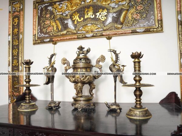 Bộ đỉnh thờ Ngũ Sự Song Long 66 Hun Cổ được bố trí theo thế tam tài, phù hợp với nguyên tắc âm dương ngũ hành trên bàn thờ. Đỉnh thờ được đặt ở vị trí trung tâm, ngay chính giữa bàn thờ, phía dưới bức hoành phi hoặc ngai thờ, thể hiện vị trí trung tâm tụ khí và là nơi dâng hương linh thiêng. Đôi hạc được đặt cân xứng hai bên đỉnh thờ, đầu hạc hướng vào đỉnh tạo thế hướng nội, thể hiện lòng thành kính và sự kết nối giữa trời và đất. Hạc thờ nên đặt hơi chếch về phía trong, không sát mép bàn để đảm bảo sự cân đối và không làm cản trở việc cúng lễ. Phần lưng rùa của hạc nên quay về phía trước, thể hiện sự vững vàng và trường tồn. Đôi chân nến đặt phía ngoài cùng, cách đôi hạc một khoảng đều nhau, đảm bảo yếu tố cân xứng và thuận tiện khi sử dụng. Nến thường được thắp vào các dịp lễ tết, ngày rằm hoặc mùng một để tạo ánh sáng linh thiêng, tôn nghiêm. Khi sắp xếp cần đảm bảo không gian thoáng đãng, không chồng chéo vật phẩm lên nhau để giữ gìn sự tôn nghiêm. Nên lau chùi và giữ gìn sản phẩm luôn sạch sẽ, sáng bóng để duy trì năng lượng tích cực và giữ gìn vẻ đẹp vốn có của bộ đồ thờ. Ban thờ đặt sản phẩm nên vững chắc, cao ráo, tránh vị trí ẩm thấp hoặc nơi có luồng khí xấu. Ánh sáng nên hài hòa, không quá chói và cũng không quá tối để đảm bảo vẻ đẹp uy nghiêm của bộ đỉnh được tôn lên trọn vẹn. Việc bố trí đúng cách không chỉ tạo nên vẻ đẹp tổng thể mà còn kích hoạt năng lượng phong thủy tốt lành cho không gian thờ cúng.