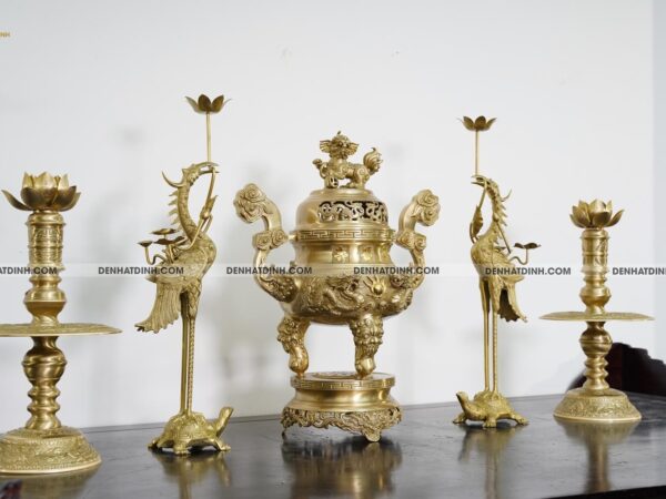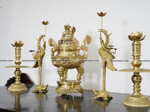 – Số lượng món: Gồm 5 món đầy đủ – 1 đỉnh đồng, 2 hạc đứng trên lưng rùa và 2 chân nến.
