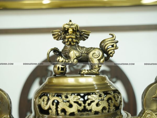 Bộ 3 chân quỳ tam lân trấn giữ trọng lượng cả bộ đỉnh nên được đúc liền nguyên khối. Với thiết kế này, gia chủ yên tâm thờ phụng mà không lo độ nóng của hương hỏa trên ban có thể làm lung lay các mối hàn hay ốc vít như những loại hàng đồng Đài Loan rẻ tiền hay gặp phải.