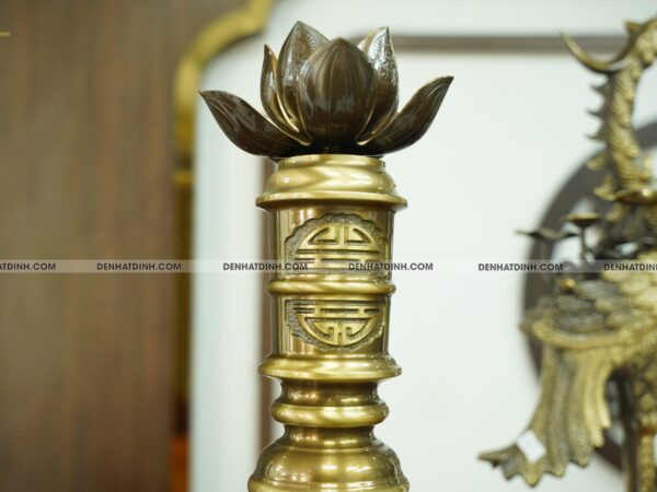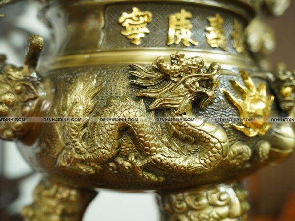 Sản phẩm được đúc hoàn toàn bằng đồng nguyên chất, trải qua quá trình xử lý hun cổ để tạo màu sắc trầm mặc, cổ kính, góp phần làm nổi bật không gian linh thiêng nơi thờ phụng. Ngoài ra, điểm đặc biệt nằm ở hình tượng song long chầu nguyệt – biểu tượng của vượng khí, sự bảo vệ và uy quyền.