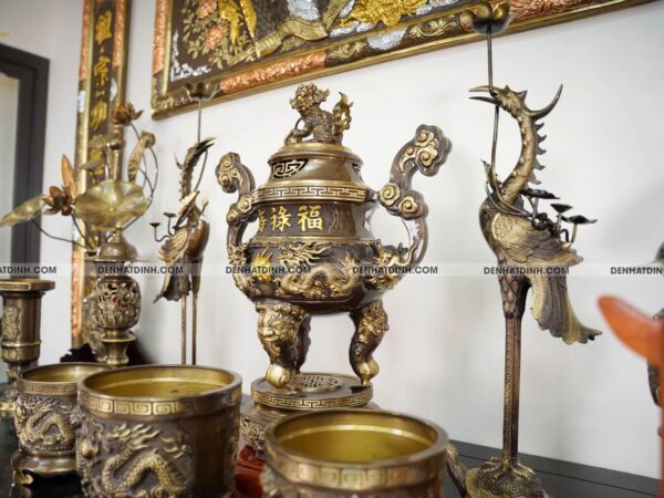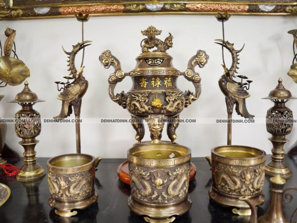 Bộ sản phẩm này không chỉ phục vụ mục đích thờ cúng mà còn là một món đồ trang trí tuyệt vời. Màu sắc hun cổ tạo nên một không gian ấm áp và trang trọng, phù hợp với bất kỳ không gian thờ cúng nào.