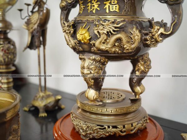 Mỗi chi tiết của Bộ ngũ sự song long 65 CNTT đều được đúc thủ công với sự tinh xảo và chăm sóc kỹ lưỡng. Từ hình dạng của đỉnh đồng đến hoa văn trên lọ hoa, tất cả đều thể hiện sự khéo léo và chuyên nghiệp của người thợ.