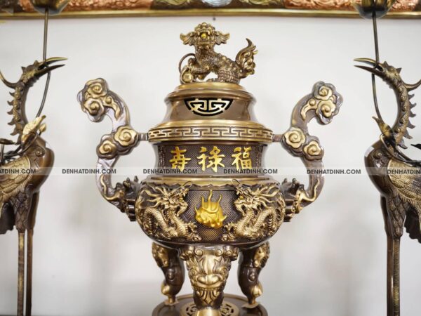 Mỗi chi tiết của Bộ ngũ sự song long 65 CNTT đều được đúc thủ công với sự tinh xảo và chăm sóc kỹ lưỡng. Từ hình dạng của đỉnh đồng đến hoa văn trên lọ hoa, tất cả đều thể hiện sự khéo léo và chuyên nghiệp của người thợ.