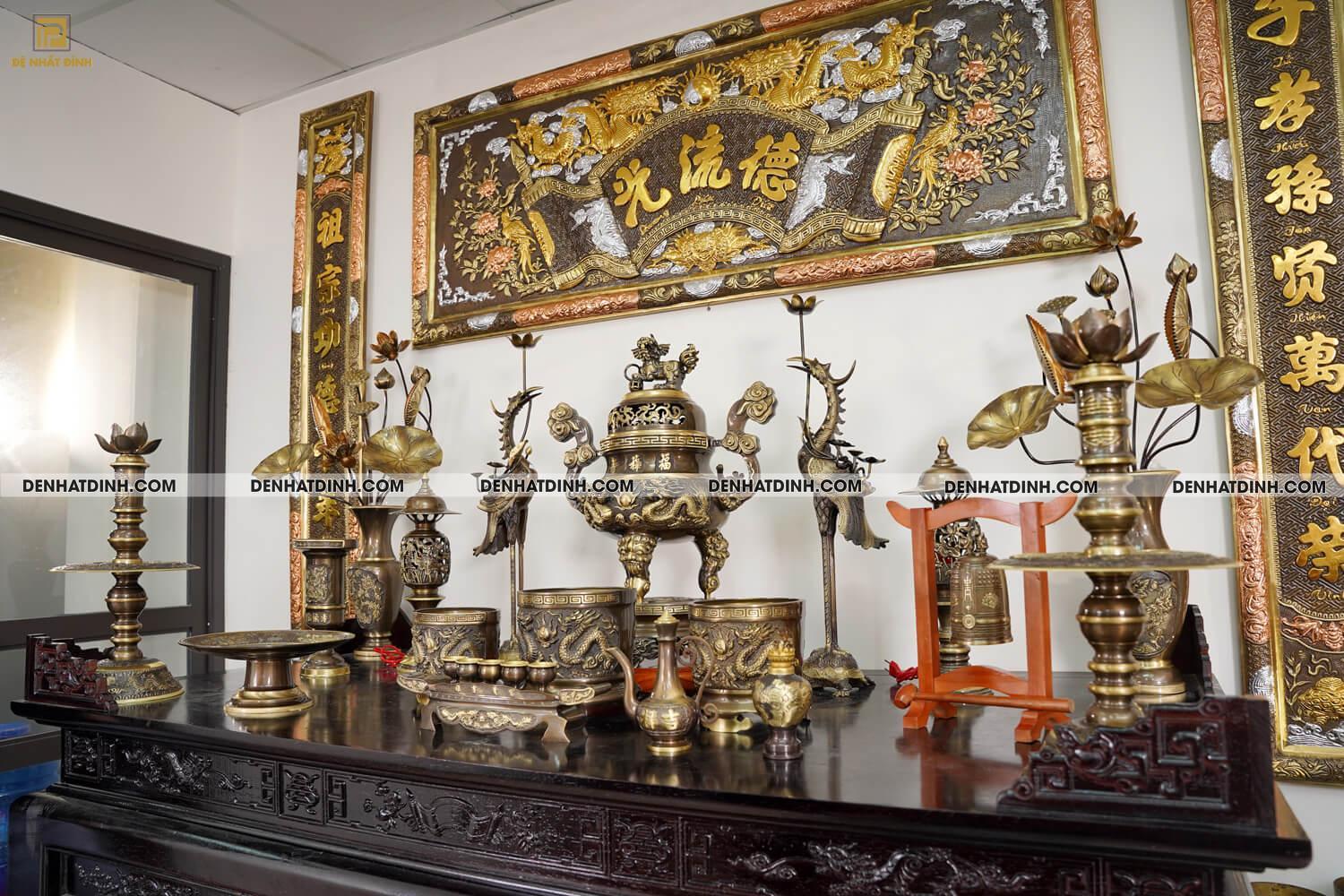 Bộ ngũ sự là một phần không thể thiếu trên bàn thờ gia tiên, bao gồm 5 vật phẩm chính: đỉnh đồng, đôi hạc đồng thờ cúng, và đôi chân nến thờ. Mỗi vật phẩm đều được chạm khắc tỉ mỉ, tinh xảo với các họa tiết truyền thống như song long chầu nguyệt, hoa sòi, và dơi ngâm đào.