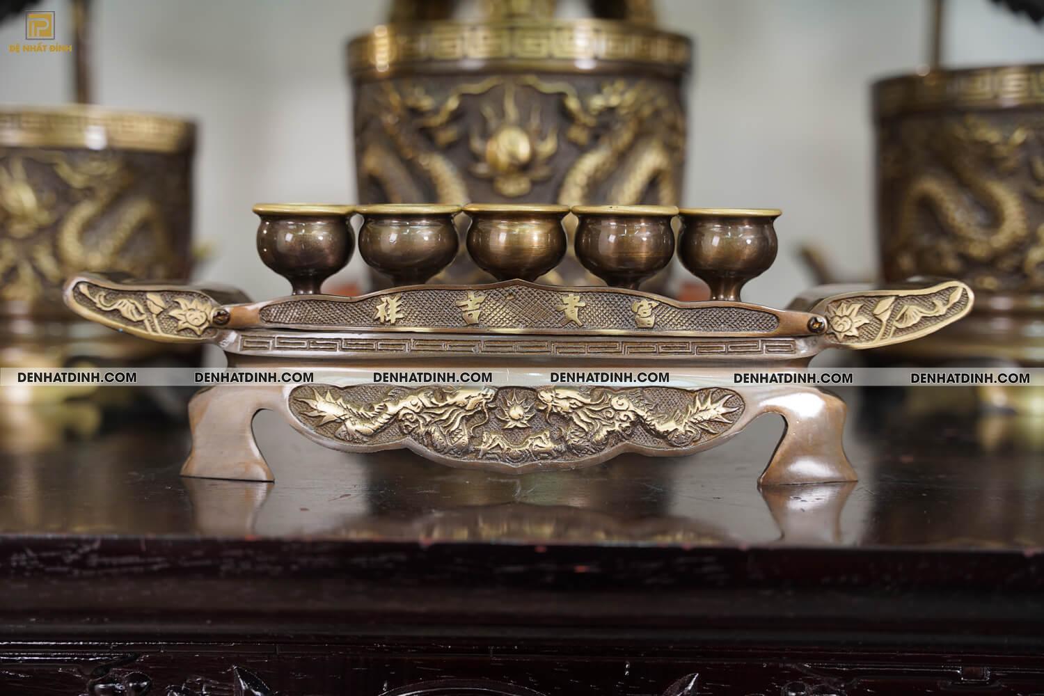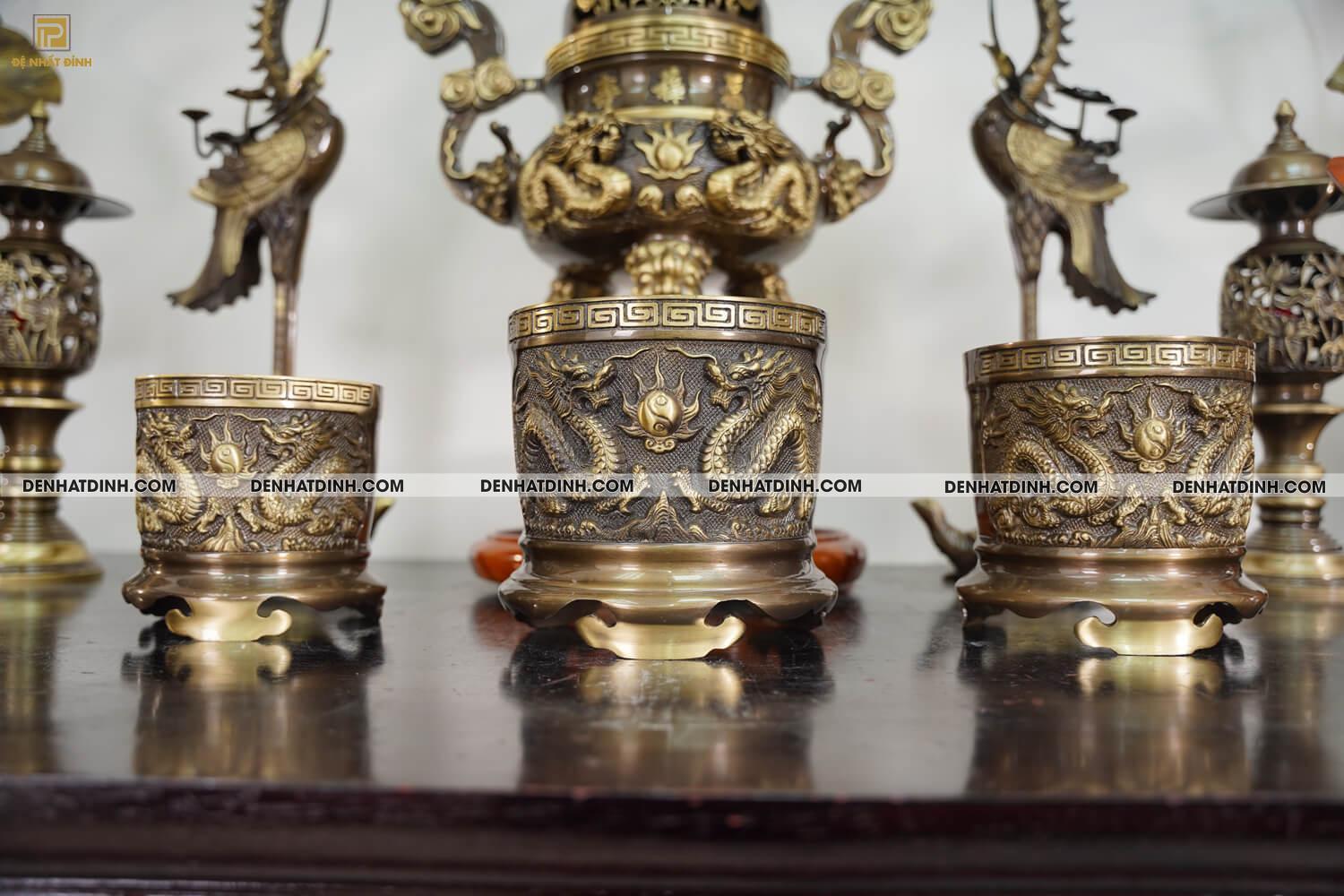 Bộ ngũ sự này nổi bật với họa tiết song long chầu nguyệt, một biểu tượng của sự may mắn, quyền lực và thịnh vượng. các họa tiết trên đỉnh đồng, hạc, và chân nến đều được chạm khắc tỉ mỉ, tạo nên một tổng thể hài hòa và tinh xảo.
