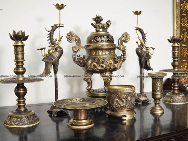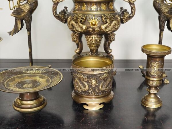 Bộ ngũ sự là một bộ gồm 5 món chính: đỉnh đồng, đôi hạc, đôi chân nến, và thường kèm thêm các phụ kiện như mâm bồng, ống hương, và bát hương . Mỗi món đều được thiết kế và chạm khắc tinh xảo, mang lại vẻ đẹp thiêng liêng và tôn kính cho không gian thờ cúng. Dưới đây là thông số kỹ thuật chi tiết: