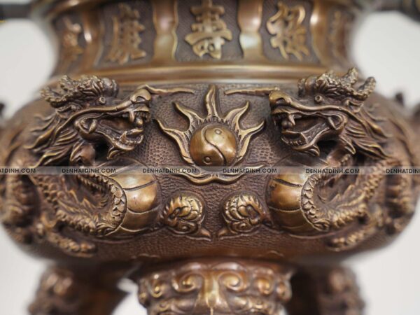 Chất liệu cao cấp là yếu tố then chốt quyết định độ bền và chất lượng của bộ ngũ sự. bộ ngũ sự song long 65 nghê mới nến đèn kỹ hun nâu được làm từ đồng thau, một loại vật liệu bền vững và có khả năng chống gỉ sét cao.