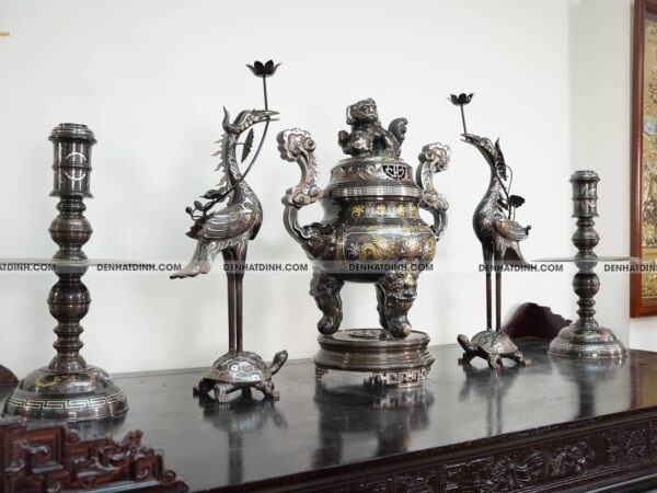 Bộ sản phẩm gồm năm món chính: đỉnh, đôi hạc, đôi chân nến, được bố trí chuẩn mực