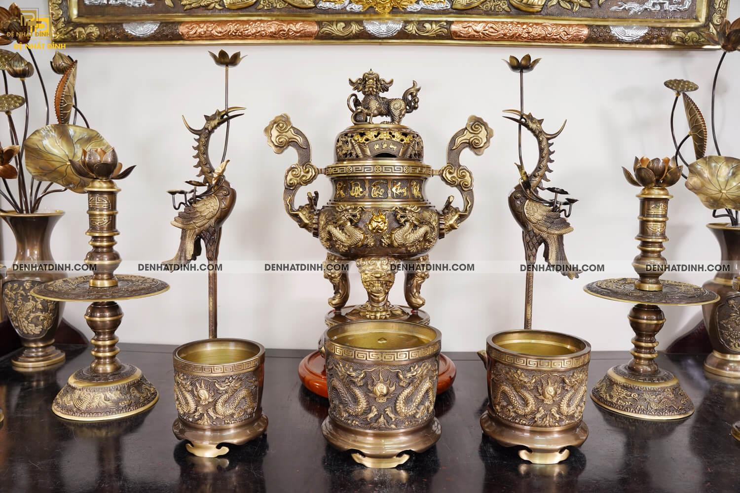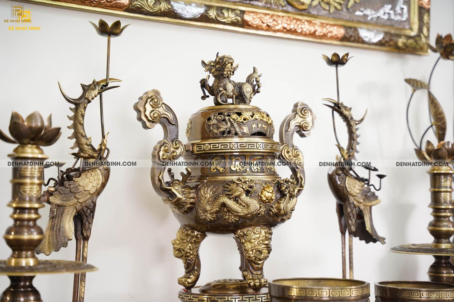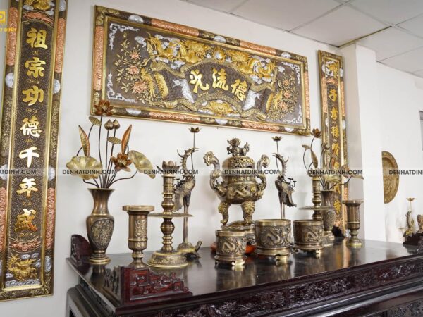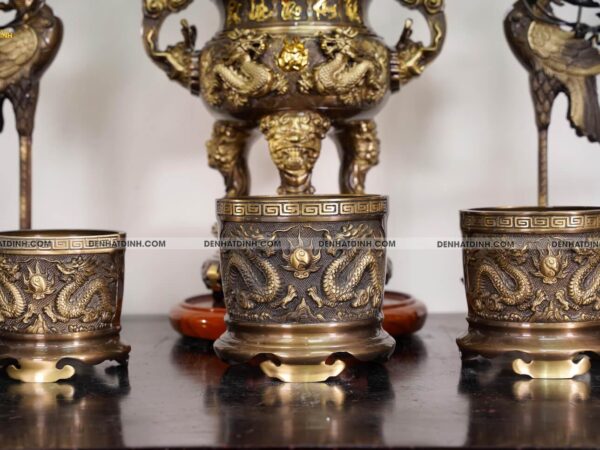 Một số chi tiết đặc biệt được dát vàng điểm nhấn, nổi bật trên nền đồng cổ kính. Kỹ thuật dát vàng sử dụng vàng quỳ cao cấp, vừa tăng tính thẩm mỹ vừa nâng tầm giá trị tâm linh cho bộ thờ.