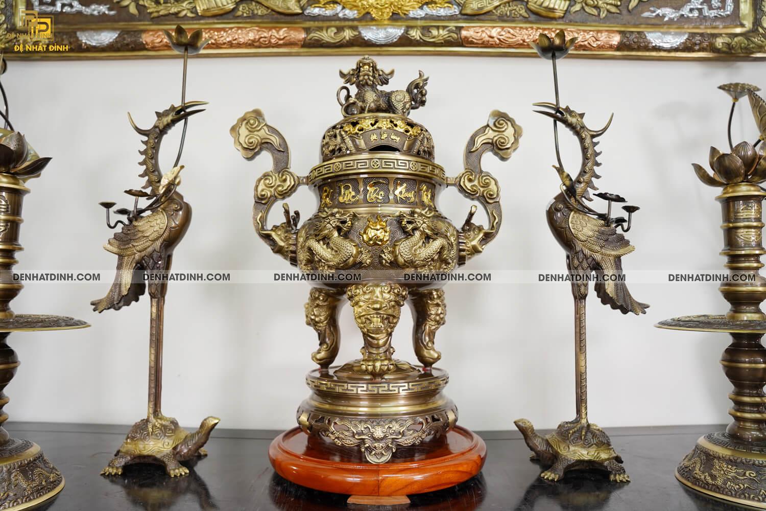 Kích thước chuẩn gồm: đỉnh đồng cao 65cm, đôi hạc cao 72cm, chân nến cao 51cm. Đây là tỷ lệ lý tưởng để đặt trên các bàn thờ rộng từ 1m75 đến 2m17. Bộ sản phẩm phù hợp cho từ đường, nhà thờ tổ, phòng thờ gia tiên hoặc bàn thờ gia đình ba cấp.