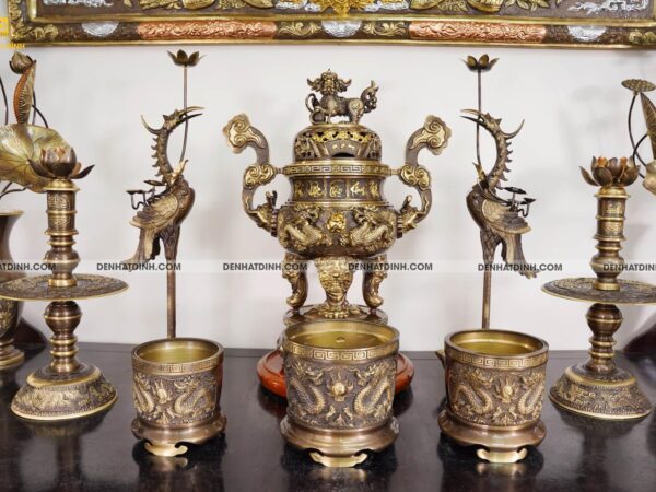 Khi nói đến việc trang trí và thờ cúng trên bàn thờ, bộ ngũ sự bằng đồng luôn là một lựa chọn tối ưu đến giá trị thẩm mỹ và ý nghĩa tâm linh sâu sắc. Trong bài viết này, chúng ta sẽ khám phá Bộ ngũ sự song long cuốn thư công nghệ (5 chữ) kèm 12 món, một sản phẩm không chỉ mang lại sự sang trọng mà còn thể hiện lòng thành kính và sự tôn vinh đối với tổ tiên.