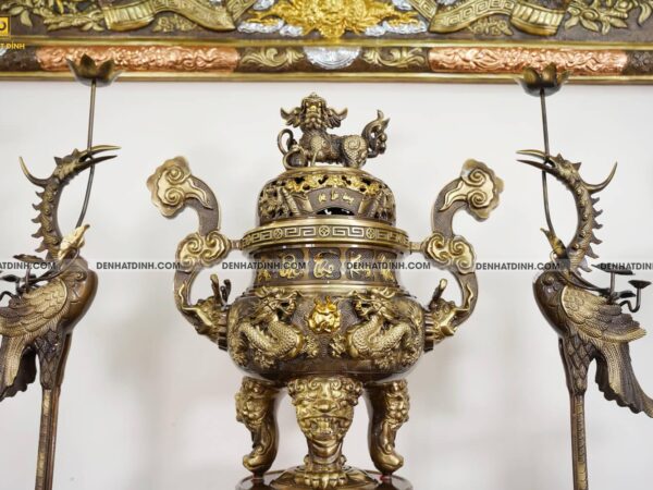 Một số chi tiết đặc biệt được dát vàng điểm nhấn, nổi bật trên nền đồng cổ kính. Kỹ thuật dát vàng sử dụng vàng quỳ cao cấp, vừa tăng tính thẩm mỹ vừa nâng tầm giá trị tâm linh cho bộ thờ.
