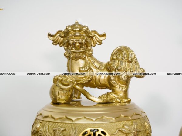 Bên trên nắp đỉnh là linh vật ông NGHÊ HÓA LÂN, được ví như tích CÁ CHÉP HÓA RỒNG. Ông nghê được ví như loài chó nhà, trấn trạch và xua đuổi tà khí cho gia chủ.