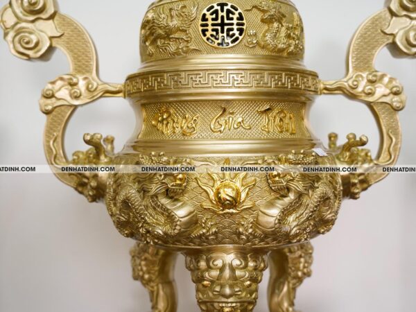 Bộ 3 chân quỳ tam lân trấn giữ trọng lượng cả bộ đỉnh nên được đúc liền nguyên khối. Với thiết kế này, gia chủ yên tâm thờ phụng mà không lo độ nóng của hương hỏa trên ban có thể làm lung lay các mối hàn hay ốc vít như những loại hàng đồng Đài Loan rẻ tiền hay gặp phải.