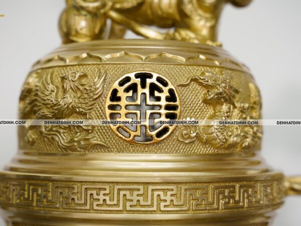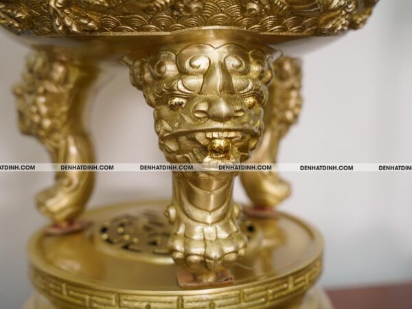 Bộ 3 chân quỳ tam lân trấn giữ trọng lượng cả bộ đỉnh nên được đúc liền nguyên khối. Với thiết kế này, gia chủ yên tâm thờ phụng mà không lo độ nóng của hương hỏa trên ban có thể làm lung lay các mối hàn hay ốc vít như những loại hàng đồng Đài Loan rẻ tiền hay gặp phải.