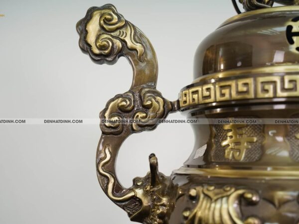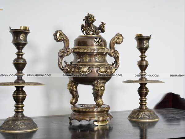 Bộ tam sự này bao gồm một đỉnh đồng cao 65cm, với họa tiết hoa sòi tinh xảo và chữ Phúc-Lộc-Thọ chạm nổi trên thân đỉnh. Đỉnh đồng được thiết kế với nắp đỉnh hình con Nghê, mang ý nghĩa xua đuổi tà khí và bảo vệ gia đình.