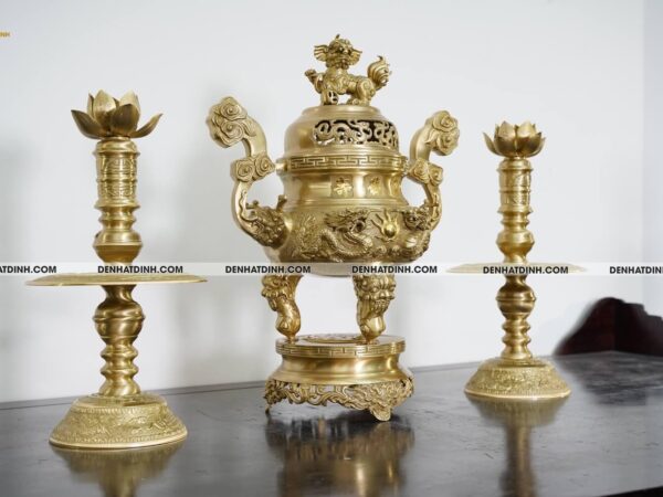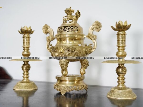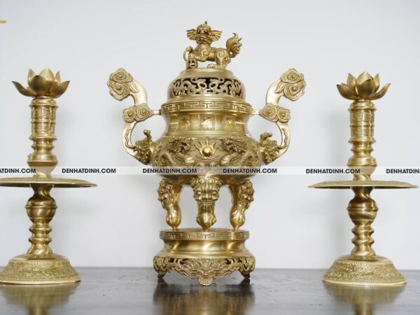 Bộ đỉnh đồng Tam sự Song long đỉnh cao 57cm, nến hoa văn cao 47cm màu vàng mộc của Đệ Nhất Đỉnh được thiết kế tinh xảo, họa tiết mang nhiều ý nghĩa được làm từ chất liệu đồng cao cấp là sự lựa chọn hoàn hảo cho không gian thờ cúng của bạn. Để tìm hiểu chi tiết về sản phẩm, bạn xem tại bài viết dưới đây.