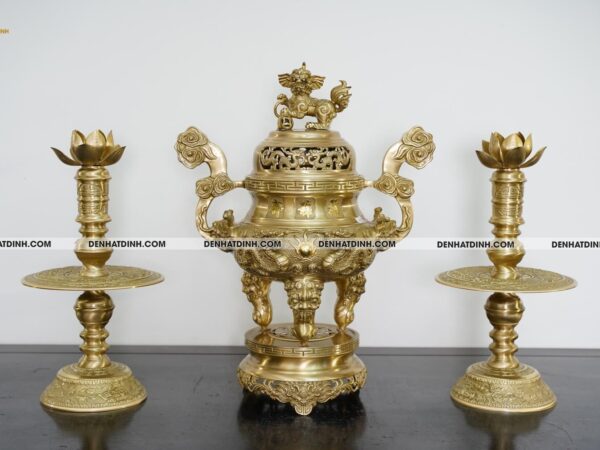 Bộ đỉnh đồng Tam sự Song long đỉnh cao 57cm, nến hoa văn cao 47cm màu vàng mộc của Đệ Nhất Đỉnh được thiết kế tinh xảo, họa tiết mang nhiều ý nghĩa được làm từ chất liệu đồng cao cấp là sự lựa chọn hoàn hảo cho không gian thờ cúng của bạn. Để tìm hiểu chi tiết về sản phẩm, bạn xem tại bài viết dưới đây.