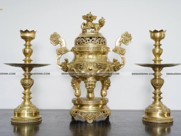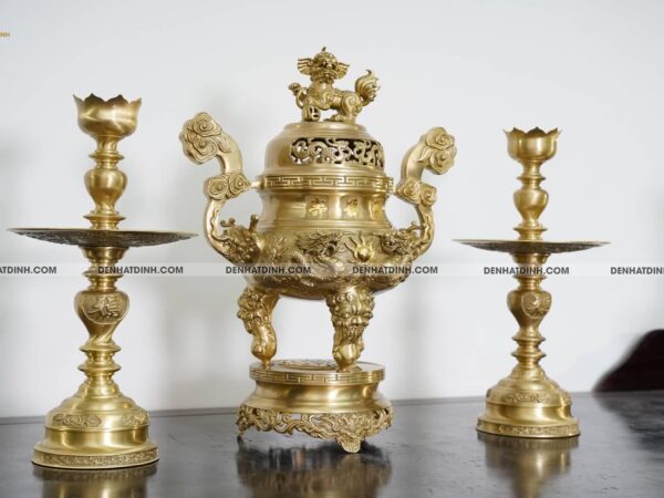 Bộ tam sự nến song long 57 mẫu 3 mộc nến kỹ được các nghệ nhân tài hoa chế tác từ đồng Catut cao cấp đúc nguyên khối, đảm bảo độ chắc chắn và chất lượng cao.
