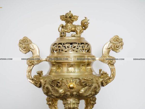 - Đỉnh đồng: Với thiết kế nắp đậy hình chóp và thân đỉnh được chạm khắc hình song long chầu nguyệt, bộ tam sự này tượng trưng cho sự kết nối giữa trời và đất, thể hiện lòng thành kính hướng về cõi tâm linh.