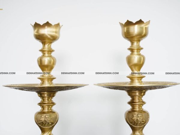 - Chân nến: Đôi chân nến được thiết kế với kiểu dáng thanh mảnh, hoa văn tinh tế, mang ý nghĩa thắp sáng không gian thờ cúng và biểu tượng của sự cân bằng âm dương trong phong thủy.