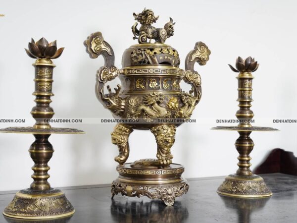 - Chân nến được đặt hai bên đỉnh đồng, tượng trưng cho mặt trời thuộc về phần dương, tạo sự cân bằng âm dương trong không gian thờ cúng.