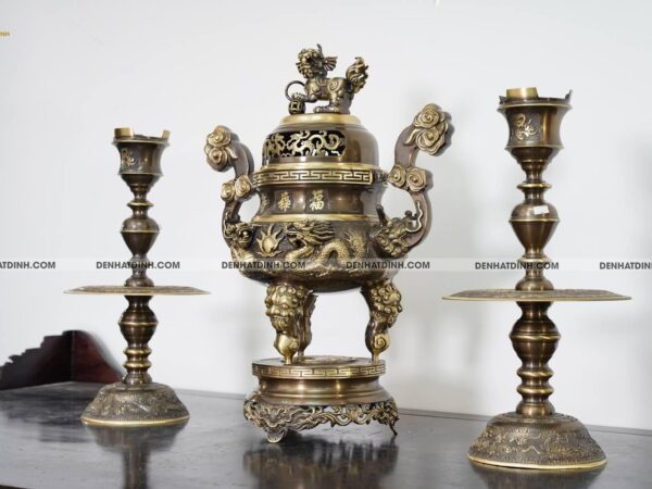 Ngoài ra, bộ tam sự này được đúc với vật liệu cao cấp là đồng catut đảm bảo độ bền và vẻ đẹp lâu dài. Kích thước của đỉnh đồng 65cm, chân nến 51cm tạo ra sự cân đối và hoàn hảo cho không gian trang trí.