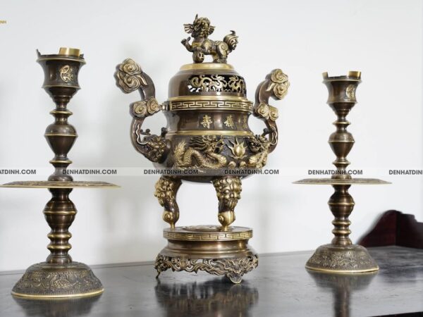 Ngoài ra, bộ tam sự này được đúc với vật liệu cao cấp là đồng catut đảm bảo độ bền và vẻ đẹp lâu dài. Kích thước của đỉnh đồng 65cm, chân nến 51cm tạo ra sự cân đối và hoàn hảo cho không gian trang trí.