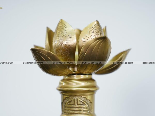 Điểm nhấn đặc biệt của mẫu chân nến này chính là phần hoa sen cách điệu trên đỉnh – nơi đặt nến. Hoa sen không chỉ là biểu tượng của sự thanh cao, tinh khiết mà còn là hình ảnh quen thuộc trong Phật giáo, thể hiện tâm linh thuần khiết, trí tuệ và sự giác ngộ.