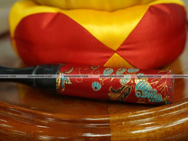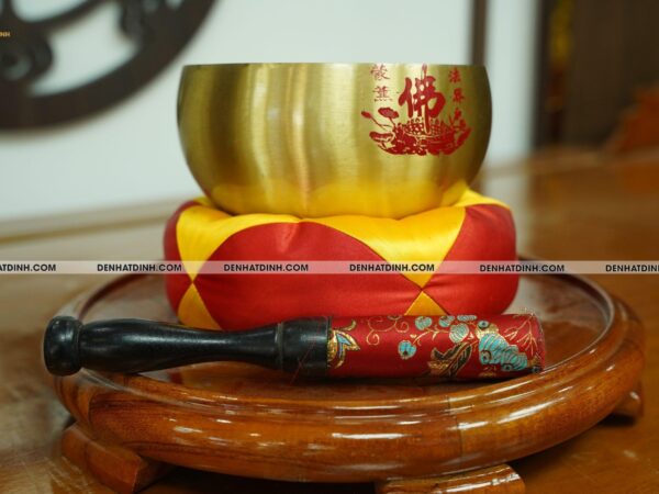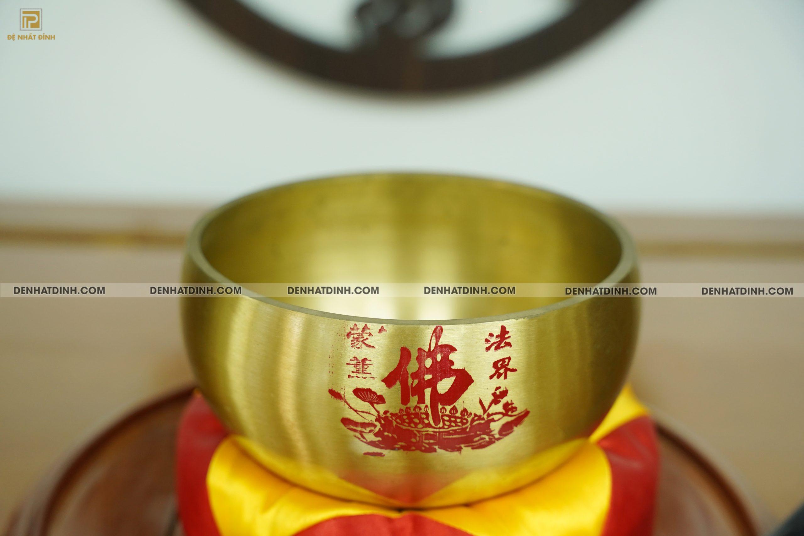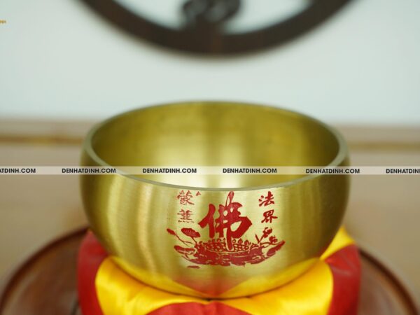 Điểm nhấn nổi bật của sản phẩm là họa tiết chữ “Phật” cùng các biểu tượng Phật giáo được khắc chìm, sơn đỏ nổi bật trên thân chuông. Hình ảnh này không chỉ tăng tính thẩm mỹ mà còn mang giá trị thiêng liêng sâu sắc, giúp người sử dụng dễ dàng tập trung tâm trí khi hành lễ hoặc thiền định.