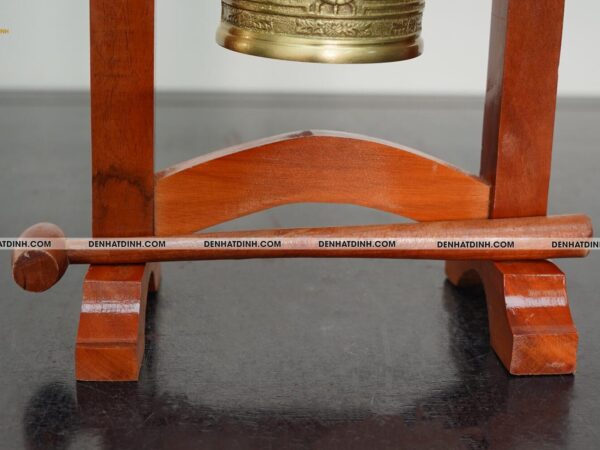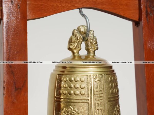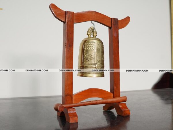 Giá treo chuông đứng vững chắc, các thanh ngang uốn lượn mềm mại, thanh dọc và góc cạnh vuông vức, đều nhau. Chuông mini 17cm có kích thước vừa phải, phù hợp với nhiều không gian thờ tự và dễ dàng lắp đặt ở nhiều vị trí khác nhau.