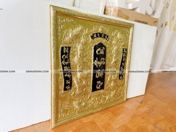 Bề mặt tranh được chạm khắc tỉ mỉ, hoa văn nổi bật với hình ảnh rồng chầu, vân mây và nền họa tiết cổ truyền.