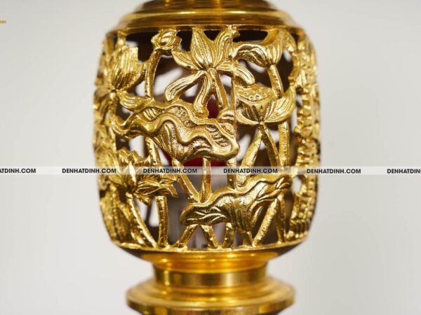 Đèn thờ điện dát vàng 24k được chế tác từ đồng đỏ cao cấp, qua nhiều công đoạn đúc, gò, tiện và dát vàng thủ công tỉ mỉ.