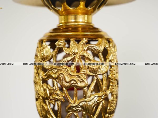 Đèn thờ điện dát vàng 24k được chế tác từ đồng đỏ cao cấp, qua nhiều công đoạn đúc, gò, tiện và dát vàng thủ công tỉ mỉ.
