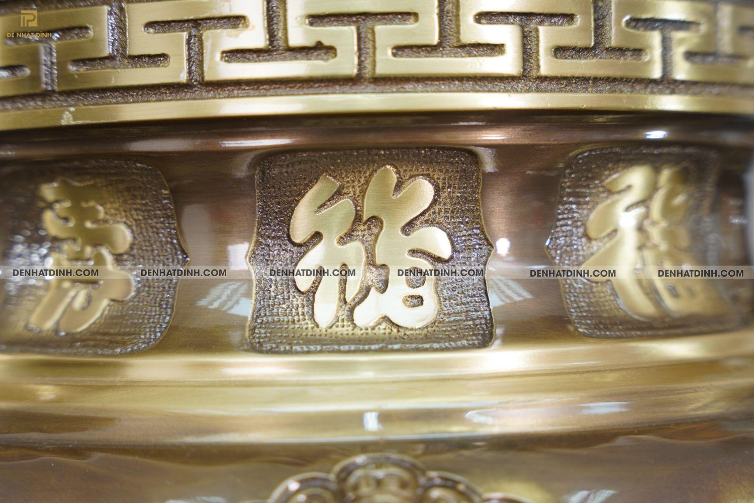 Phần bụng đỉnh được chạm nổi ba chữ Phúc – Lộc – Thọ bằng thủ pháp điêu luyện, tượng trưng cho ba điều phúc khí lớn nhất đời người. Trên nắp đỉnh là hình tượng nghê chầu oai vệ, biểu trưng cho sự canh giữ linh khí và trấn trạch.