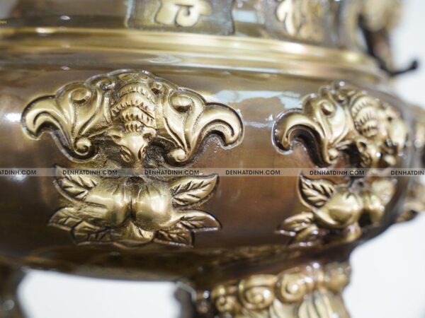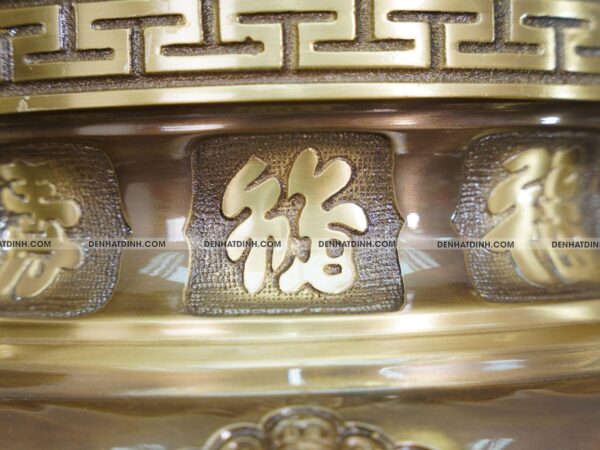 Phần bụng đỉnh được chạm nổi ba chữ Phúc – Lộc – Thọ bằng thủ pháp điêu luyện, tượng trưng cho ba điều phúc khí lớn nhất đời người. Trên nắp đỉnh là hình tượng nghê chầu oai vệ, biểu trưng cho sự canh giữ linh khí và trấn trạch.