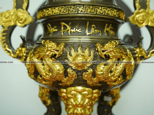 Đây là dòng sản phẩm đồ thờ bằng đồng mang giá trị sử dụng truyền đời, có chất lượng độ bền cực cao. Vượt xa so với các sản phẩm từ gốm, gỗ, sứ. Bề mặt Đỉnh đồng Ngũ Phúc Lâm Môn 65 dát vàng được dát vàng ta mang lại chất lượng màu sắc sáng đẹp, gần như không đổi với thời gian, tạo ra được nhiều nét riêng biệt theo năm tháng.
