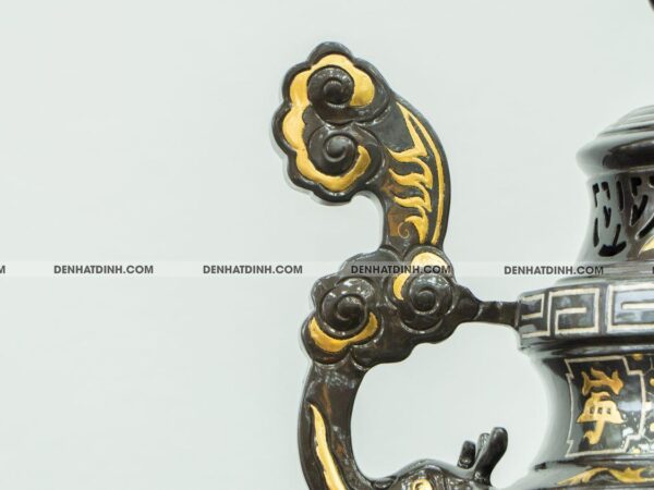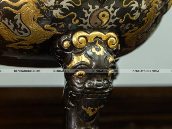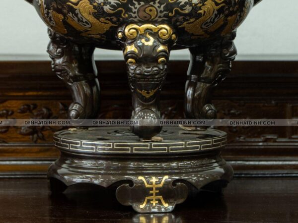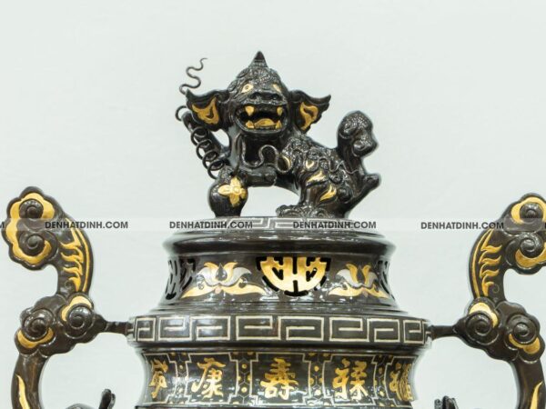 Thân đỉnh có hình dáng tròn đầy, tượng trưng cho sự viên mãn, cân đối. Phần nắp được đúc tượng nghê chầu, mang thần thái oai vệ và thiêng liêng. Hai tay đỉnh được tạo hình mềm mại theo họa tiết hoa sòi cách điệu, uốn lượn tinh tế, tôn lên sự mềm mại và quý phái. Phần chân đỉnh được tạo hình vững chãi với ba chân thú, vừa tăng sự ổn định vừa thể hiện uy quyền và sự trang nghiêm của sản phẩm.
