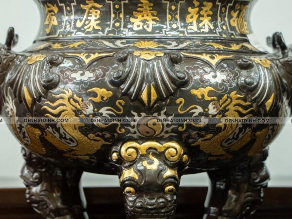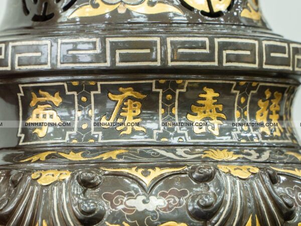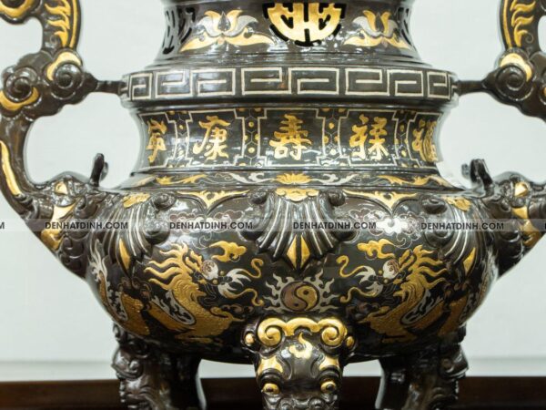 Các dòng chữ Hán như “Phúc Lộc Thọ Khang Ninh” hay hoa văn long phụng, mây trời đều được khảm kỹ thuật cao, sắc sảo và có chiều sâu. Đặc biệt, màu sắc của khảm tam khí trên nền đồng trầm tạo nên sự sang trọng, cổ kính và trường tồn theo thời gian.
