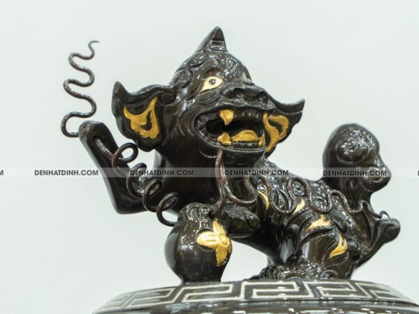 Hình tượng nghê chầu trên nắp đỉnh là biểu tượng linh vật thiêng, chuyên trấn giữ không gian thờ cúng và ngăn ngừa năng lượng xấu. Nghê còn đại diện cho sự uy nghi, giúp bảo vệ gia đạo và mang đến sự an lành. Chất liệu đồng đỏ cùng sự khảm tam khí làm tăng tính dẫn khí, kích hoạt tài vận, hỗ trợ gia chủ về công danh, sự nghiệp và sức khỏe.