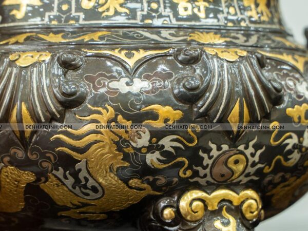 Đỉnh đồng khảm tam khí không chỉ là vật phẩm trang trí mà còn mang giá trị phong thủy mạnh mẽ. Trong văn hóa thờ cúng của người Việt, đỉnh đồng có vai trò như trung tâm năng lượng, giúp điều hòa âm dương và mang lại vượng khí cho ngôi nhà. Đỉnh đồng hoa sòi 60 khảm tam khí với họa tiết long phụng, mây trời và các biểu tượng cát tường giúp thu hút sinh khí, trấn trạch và hóa giải tà khí.
