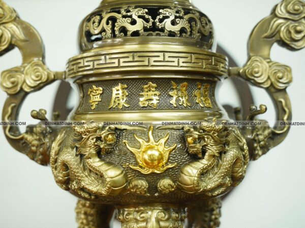 Tác phẩm được trang trí với các họa tiết bắt mắt, ý nghĩa. Mặt chính diện của đỉnh đồng có năm chữ Phúc Lộc Thọ Khang Ninh được dát vàng sáng bóng làm nổi bật bộ đỉnh. Phía dưới là đôi rồng chầu mặt nguyệt. Hình ảnh rồng hiện lên với thân rắn, vảy cá chép, móng đại bàng, bờm sư tử, sừng hươu đang chầu nguyệt được dát vàng 24k. Mặt phía sau chạm khảm hình ảnh phượng hoàng cùng hướng về vầng nguyệt rực sáng, hai chân cùng giữ cuốn thiên thư. Đôi phượng hoàng cùng sải cánh giữa bầu trời, phía trên là chữ Phúc Lộc Thọ được viết bằng chữ Hán.