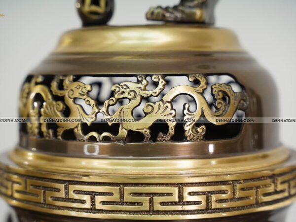 Đỉnh Rồng được chế tác từ đồng Catut, một loại đồng cao cấp. Đỉnh có chiều cao 65cm, tạo nên sự cân đối và hài hòa khi đặt trên bàn thờ hoặc trong không gian trang trí. Sản phẩm có màu hun của đồng Catut mang lại một vẻ đẹp cổ điển và sang trọng, phù hợp với nhiều phong cách trang trí khác nhau.