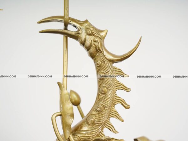 Mình hạc nhỏ nhắn, mảnh mai và sở hữu bộ lông vũ mỏng manh, mềm mại. Đôi chân khẳng khiu của chim hạc đứng vững vàng ở trên mai rùa. Ở đây, con rùa sở hữu bốn chân chắc khỏe. Thế đứng của nó vô cùng mạnh mẽ. Bộ mai thì tựa như ô bàn cờ. Dường như nó cũng ngẩng đầu lên cao để chiêm ngưỡng hoa sen!