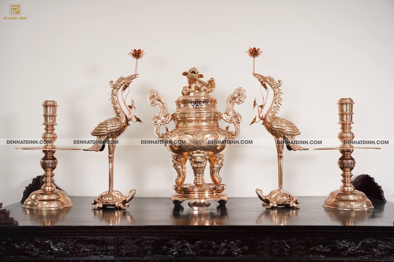 Khi kết hợp với đỉnh đồng đỏ ở giữa và đôi chân nến đồng hai bên ngoài, đôi hạc thờ cao sẽ tạo nên một bộ ngũ sự hoàn chỉnh, chuẩn phong thủy và giàu ý nghĩa tâm linh. Bộ ngũ sự không chỉ đảm bảo yếu tố thẩm mỹ mà còn cân bằng năng lượng âm dương, hỗ trợ tâm linh và tài lộc cho gia chủ.