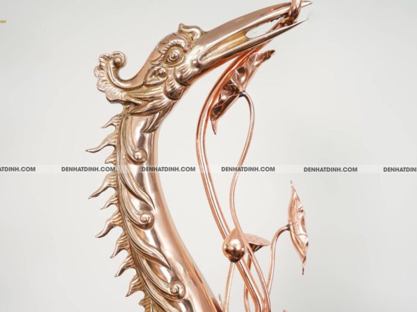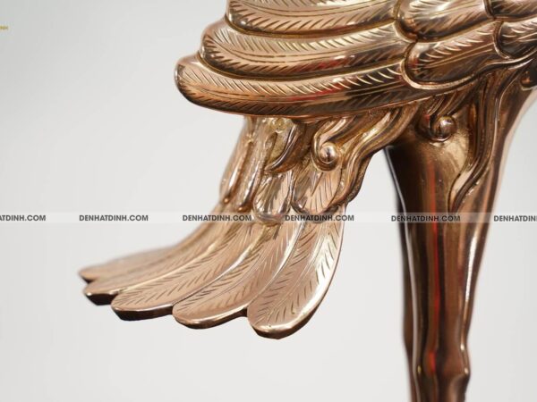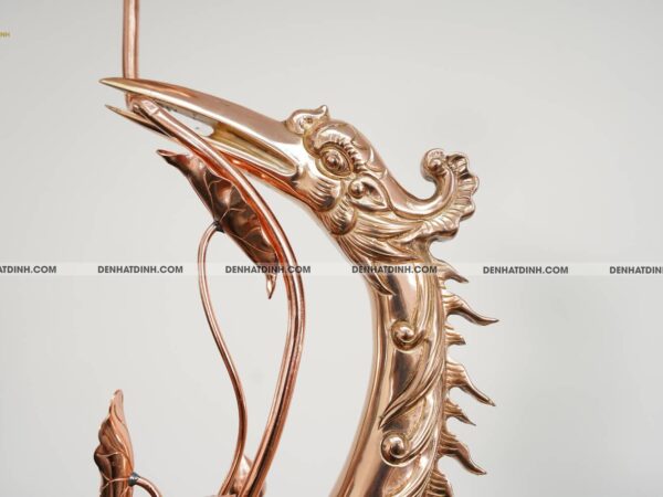 Từng chi tiết trên thân hạc như vảy lưng, cánh, cổ và đầu đều được chạm nổi tinh xảo, mềm mại và sống động. Hạc ngậm hoa sen trong miệng, tượng trưng cho sự thanh cao và thuần khiết. Dáng đứng thẳng, cổ vươn cao, đầu ngẩng lên trời thể hiện sự mạnh mẽ, hiên ngang và kết nối giữa cõi dương và cõi âm.