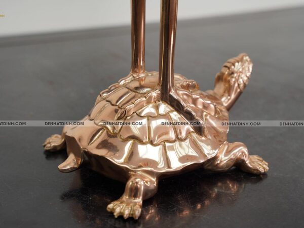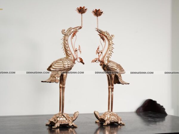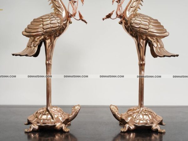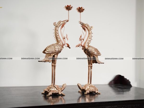 Khi kết hợp với rùa – biểu tượng của sự ổn định và trường tồn – cặp linh vật này thể hiện sự dung hòa âm dương, nâng cao sinh khí cho ngôi nhà, đồng thời củng cố phúc khí cho gia chủ. Việc bài trí đôi hạc đồng đỏ trên ban thờ giúp tăng cường năng lượng tích cực, hỗ trợ gia chủ trong công danh, tài lộc và sức khỏe.